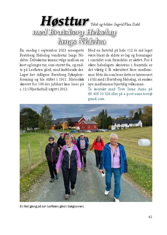Dette er den 20. utgaven av årboka Njardarholl. I 2016 kom den 11. utgaven, og siden da har NBHL (Nardo og Bratsberg Historielag) utgitt årbok hvert år. Stoilgangen har vært god, og vi har fått mange otte bidrag, i form av artikler, bilder, intervjuer og tips. Bratsberg kirke er 175 år i år, og NBHL markerer kirkejubileet med to artikler. Den ene er om kirkas historie, og den andre er historien om hva som skjedde med begravelsesvogna, eller likvogna i Bratsberg. Vi har med en «røverhistorie» på Leira gods fra 1840 og historikk om bruk av jernovner. Tømmeret i stabburet på Stendahl Nordre ble hogd i 1755, og fundamentet skal rehabiliteres tilbake til opprinnelig stand.